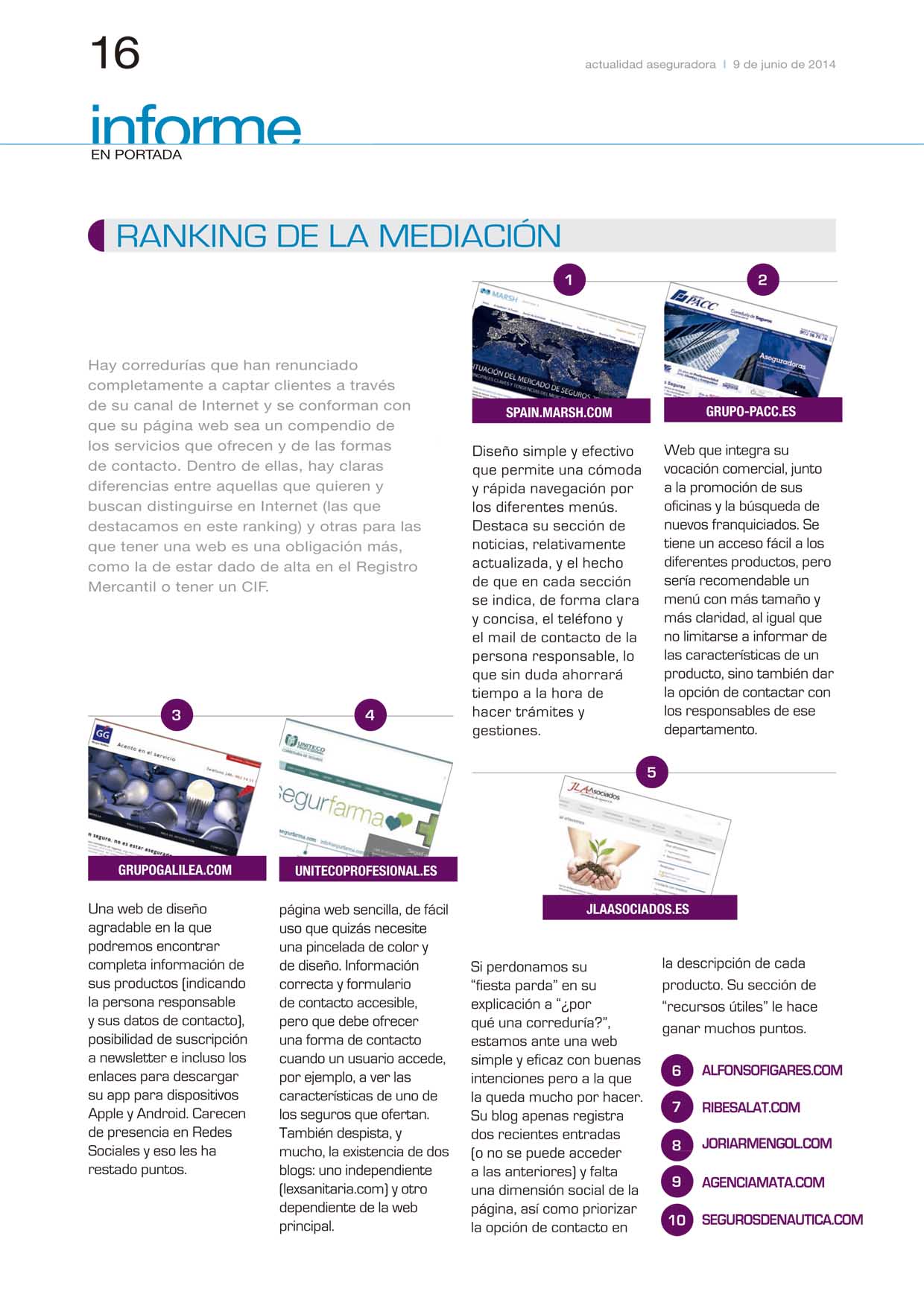 Somos la sexta correduria de seguros en Internet dentro del Ranking de La Mediación según el informe «Las Webs del Seguro 2014» realizado por la revista Actualidad Aseguradora, prestigiosa publicación especializada en el sector asegurador, que cada año hace un análisis de las distintas páginas webs que guardan relación con el sector del seguro en toda España.